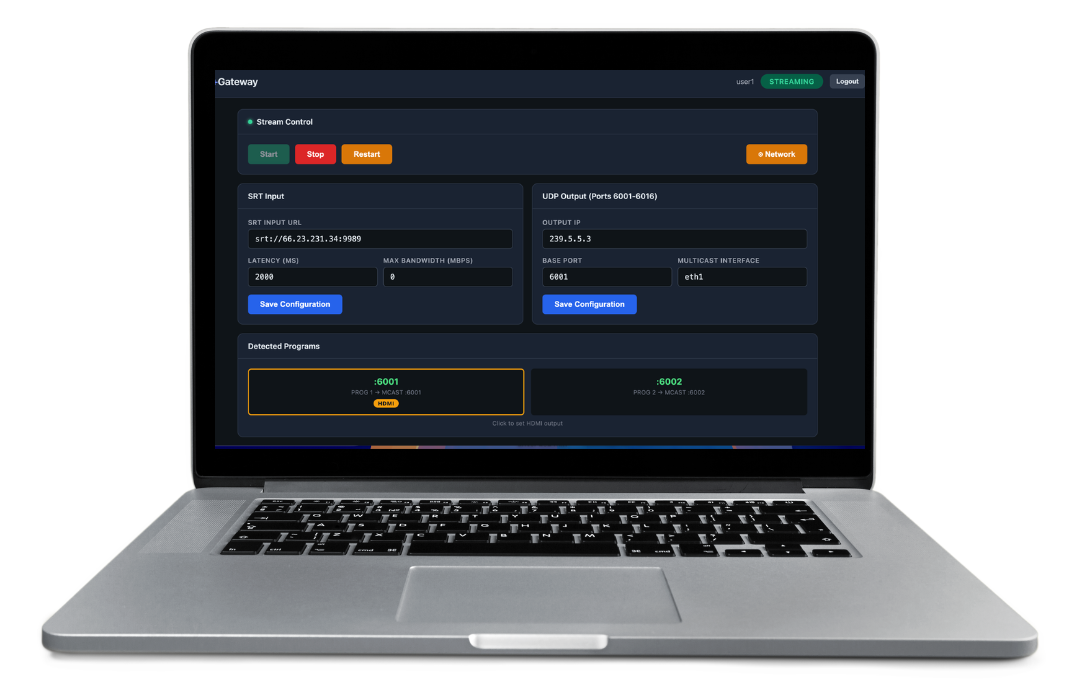 Installable software for compatible hardware (Ubuntu 24 LTS). Features configurable I/O streams, failover, switchable HDMI output, bandwidth limits, live monitoring, email alarms, and 2 years of updates included. Contact sales for a 1-week free trial. You will receive installation instructions. Send your streams or use our provided test streams. Proceed with purchase after testing.