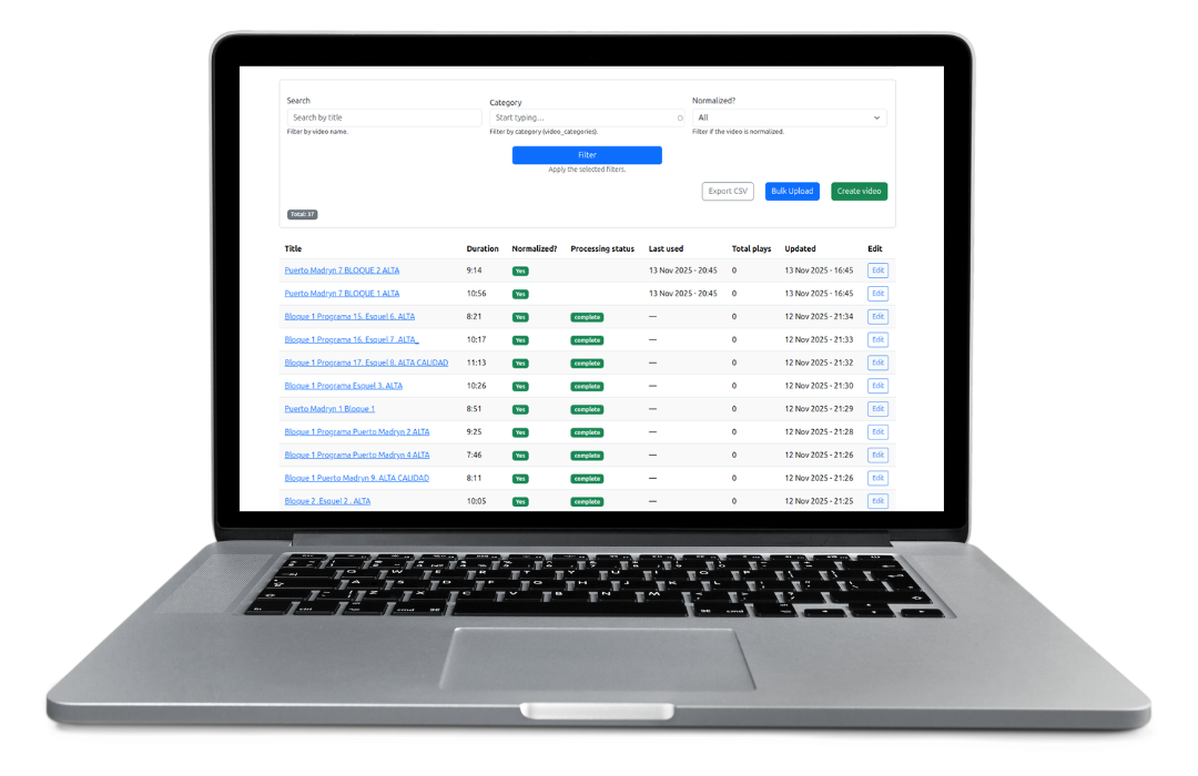 Compatible with all video formats. Automatic transcoding (content preparation). On screen Logo (bug) per video file. LIVE content scheduling!. SCTE-35 Markers for Advertising, Local News, Events, Insertions. Based on workplace (STUDIO) for many channels, many users (teams). CDN ready! for your OTT business or Direct Delivery (SRT).