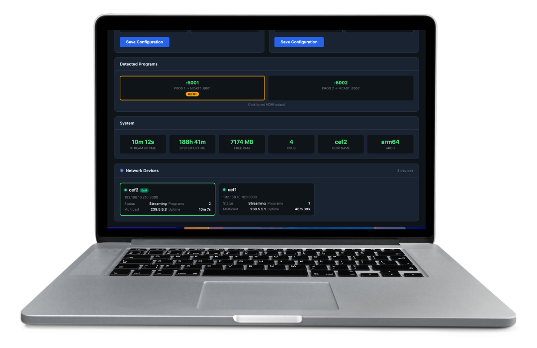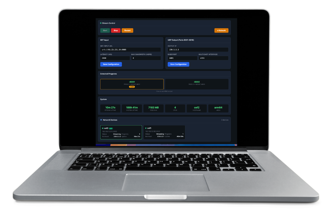 Local Control Panel: Provides direct access to your gateways for essential hardware configurations, including network settings, UDP/SRT/HLS/HDMI addressing, and device-level maintenance.